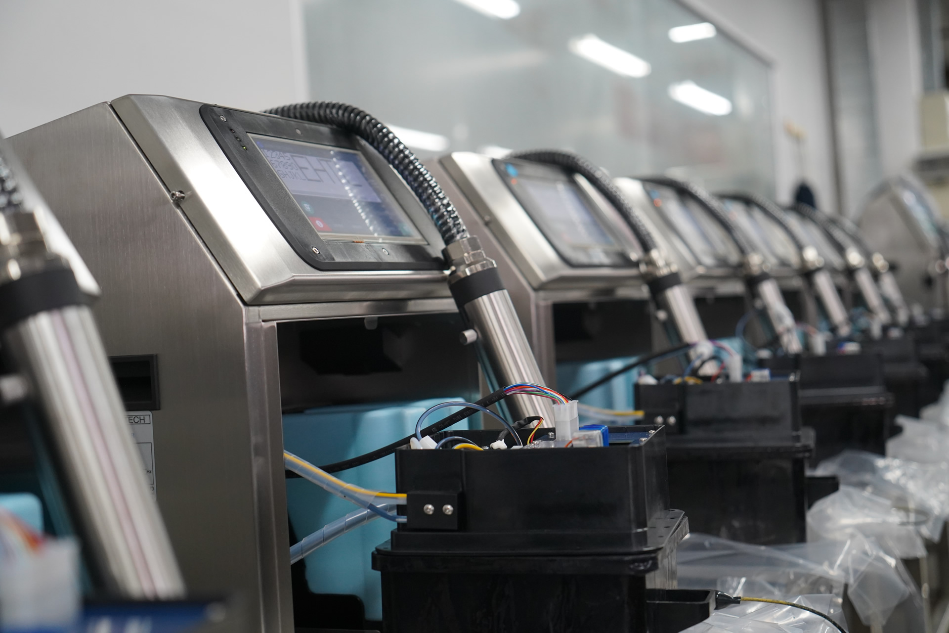 LEAD TECH為智能工廠定制機型及機器運行軟件,200臺噴碼機在無人操控環境下與客戶操作系統連接,根據系統指令協同產線工作賦予每個產品全球唯一的編碼和精確到毫秒的全球同步生產時間。